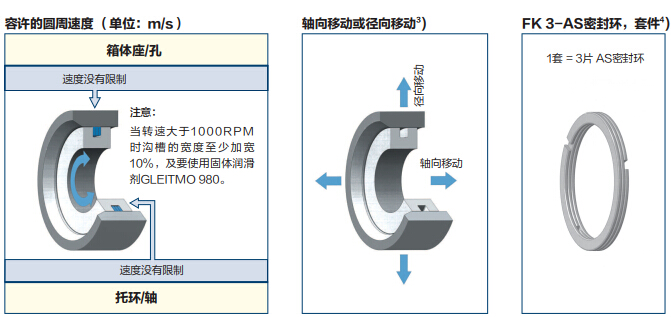 用于滾動(dòng)及滑動(dòng)軸承的油脂密封,如果抹上油脂,它能防止灰塵的侵入及環(huán)境濕度的影響。組合套件“FK 3-ASK” (增加溝槽底部的密封)由于迷宮的回路增加其密封效果也增加了。